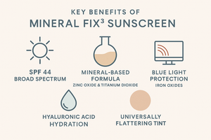 MDAiRE™'s Mineral Fix³ SPF 44 delivers powerful mineral-based sun protection with a universally flattering tint and soft dewy finish. Formulated with hyaluronic acid to deeply hydrate and antioxidant support to help protect against environmental stress and promote overall skin clarity. This water-resistant SPF seamlessly blends into most skin tones to visibly smooth, even, and brighten the complexion. Ideal for melasma-prone or sensitive skin seeking high-performance daily sun protection with a perfected finish
