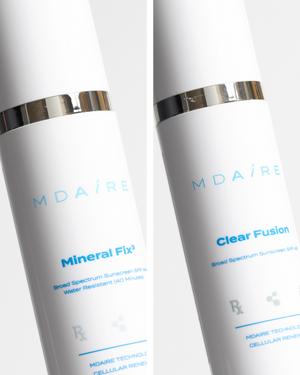 MDAiRE™'s Total Protection SPF Duo combines two advanced daily sunscreens designed to deliver high-performance sun protection with added skincare benefits—one sheer and invisible, the other tinted and perfecting for complete coverage and daily defense.