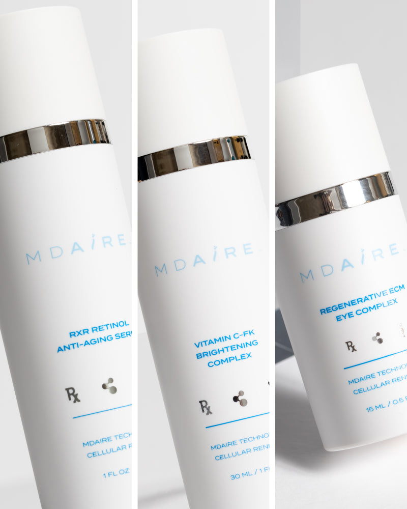 MDAiRE™’s Aging Gracefully Trio is a targeted trio designed to combat visible signs of aging and restore youthful radiance. This routine works synergistically to improve texture, brighten skin tone, soften fine lines, and support collagen for long-term skin health.